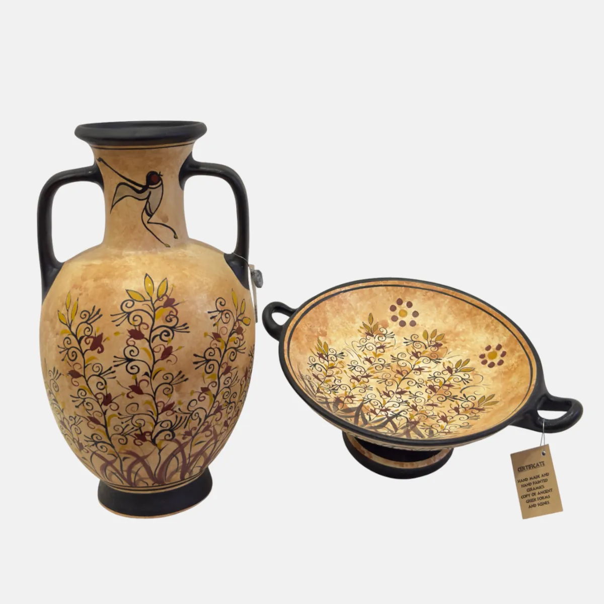 Η διακόσμηση περιλαμβάνει φυσιοκρατικά σχέδια, φυτικά μοτίβα, θαλάσσια σύμβολα και γεωμετρικά σχήματα, σε αυθεντικές αποχρώσεις ώχρας, καστανού και κεραμιδί. Αυτά τα αγγεία και διακοσμητικά δεν είναι μόνο αντικείμενα τέχνης, αλλά και φορείς πολιτιστικής κληρονομιάς, που αποπνέουν την τελετουργική και αισθητική σημασία του μυκηναϊκού κόσμου.